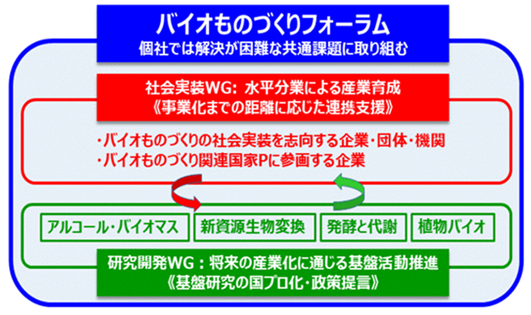 これまで、JBAのものづくり系4研究会(発酵と代謝研究会、アルコール·バイオマス研究会、新資源生物変換研究会、植物バイオ研究会)の連携強化やグリーンバイオ基盤研究推進の提案·提言などの活動を進めてきたグリーンバイオイノベーションフォーラム(GIF)は、本フォーラムでの研究開発ワーキンググループ(WG)として、継続し発展させます。加えて、社会課題の解決につながる事業を展開するための環境整備や、消費者などへの受容を促す仕組みづくりを行う社会実装WGを新設し、2つのWGを一体運営し、産業構造の最適化を通じて、バイオエコノミ一社会の実現を図ります。